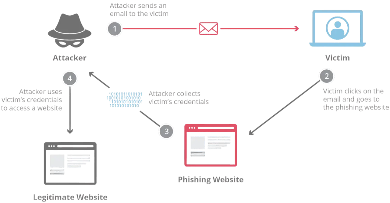 معمولاً مهاجم ابتدا یک وبسایت یا ایمیل جعلی ایجاد میکند. سپس با ارسال لینک یا پیوست به قربانی، او را فریب میدهد تا اطلاعات شخصی خود را وارد کند یا بدافزاری را دانلود نماید. با این اطلاعات، مهاجم به دادههای حساس یا حسابهای کاربری دسترسی پیدا میکند.